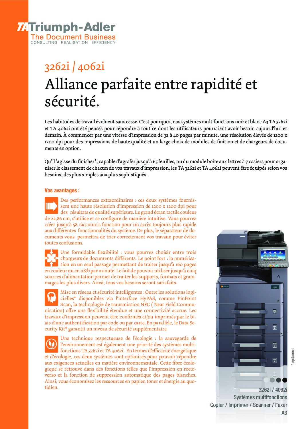 Mobilité : Compatibilité NFC, Application TA Mobile Print, protocole Apple AirPrint ou Android Mopria pour imprimer les documents ou les télécharger dans le Cloud
