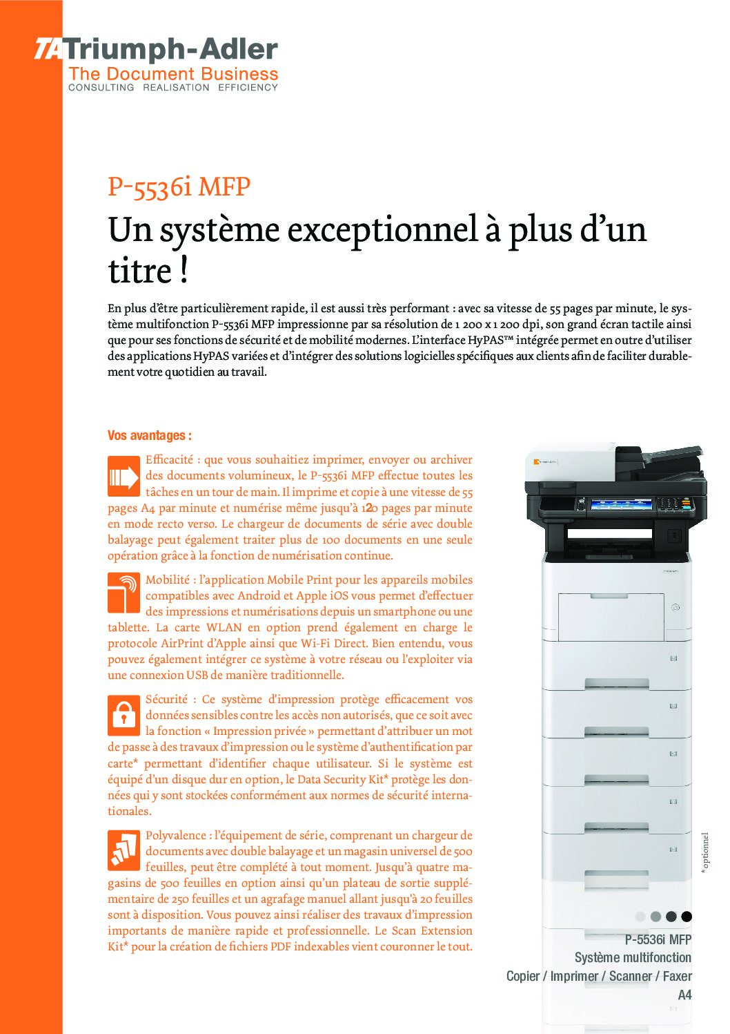 • Efficacité : que vous souhaitiez imprimer, envoyer ou archiver des documents volumineux, le P-5536i MFP effectue toutes les tâches en un tour de main. Il imprime et copie à une vitesse de 55 pages A4 par minute et numérise même jusqu’à 100 pages par minute en mode recto verso. Le chargeur de documents de série avec double balayage peut également traiter plus de 100 documents en une seule opération grâce à la fonction de numérisation continue.